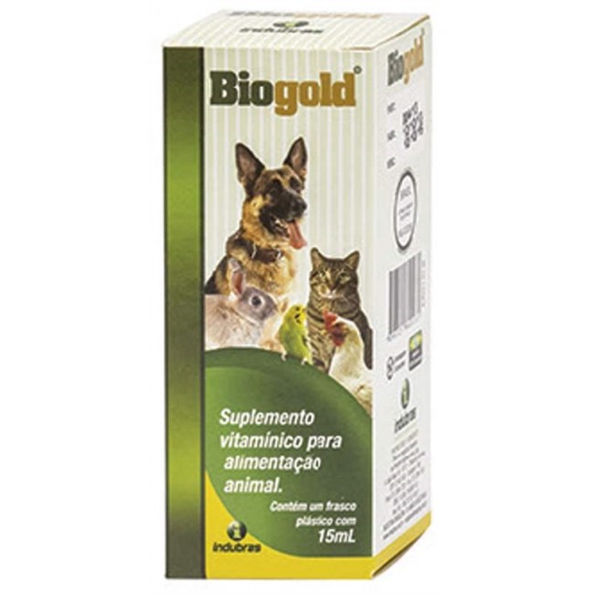 Biogold Indicações Suplemento vitamínico para cães, gatos, coelhos, suínos, ovinos, caprinos, bovinos, equinos e aves, jovens e adultos, visando melhorar o desempenho físico e reprodutivo dos animais. Em aves especificamente, é indicado para suprir as necessidades nutricionais de vitaminas nas fases de crescimento, cruzamento, muda de penas, postura e choco. Níveis de garantia do produto: Vitamina B1 mínimo 4630mg Vitamina B2 mínimo 4000mg Vitamina B6 mínimo 2980mg Vitamina B12 mínimo 7000mcg/L Vitamina A mínimo 2.500.000UI/L Vitamina E mínimo 7500UI/L Vitamina D3 mínimo 750.000UI/L Nicotinamida mínimo 20.000mg Modo de usar Administrar por via oral, diretamente na boca do animal ou misturado à água de beber, leite ou ao alimento, nas seguintes dosagens: Pintos: 2mL por litro de água de beber por dia. Aves adultas: 3mL por litro de água de beber por dia. Aves ornamentais: 4 gotas por dia no bebedouro de 50mL. Coelhos: 1mL por dia por animal. Gatos: 1mL por dia por animal. Cães até 5 kg: 1mL por dia por animal. Cães de 5 a 20 kg: 2mL por dia por animal. Cães acima de 20 kg: 3mL por dia por animal. Leitões: 2mL por dia por animal. Ovinos e caprinos: 5mL por dia por animal. Potros: 6mL por dia por animal. Equinos adultos: 15mL por dia por animal. Bezerros: 6mL por dia por animal. Bovinos adultos: 20mL por dia por animal. Suínos: Fêmeas em gestação e machos adultos: 4mL por dia por animal. Suínos: Fêmeas em lactação e reprodutores: 8mL por dia por animal. Apresentação Frasco contendo 15mL e 50mL.